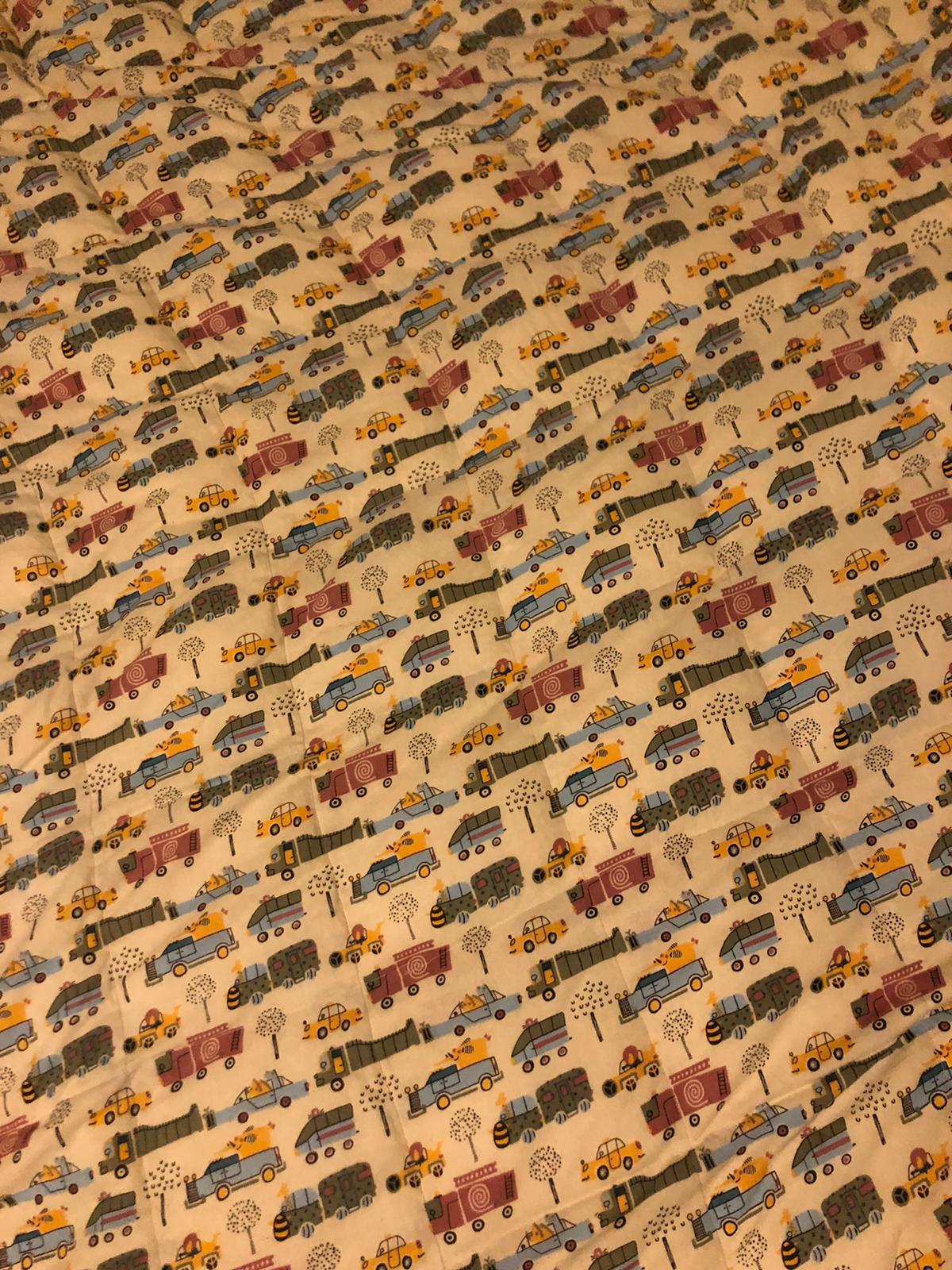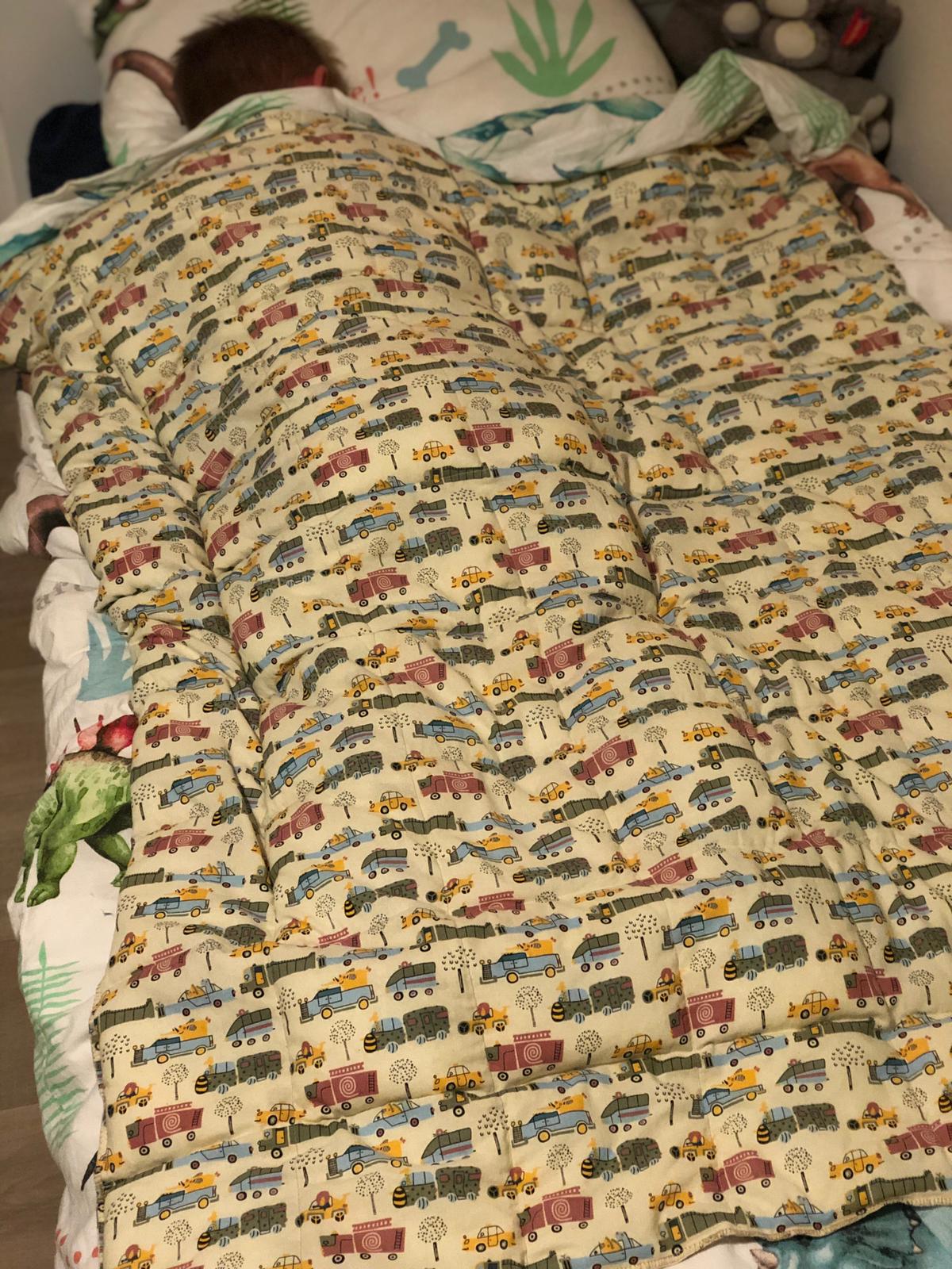 Op een gegeven moment had ik het met een vriendin over verzwaringsdekens. Zij wilde er erg graag eentje hebben voor haarzelf en haar zoontje. Mijn vriendin was bijna jarig en ik dacht; ik maak die verzwaringsdeken voor jou. Voordat ik hieraan begon heb ik mij eerst verdiept in de werking van een verzwaringsdeken. Hoe meer ik hierover las, hoe meer ik het idee kreeg om ook een verzwaringsdeken voor L. te gaan maken. Mijn hoop was dat L. door de verzwaringsdeken dieper zou gaan slapen waardoor er wellicht minder kans op een nachtangst zou zijn. Het was natuurlijk het proberen waard! Ik heb L. zelf de stof laten kiezen in de stoffenwinkel. Hij koos voor een stof met allemaal soorten voertuigen erop. Autootjes, vrachtwagens, noem maar op. Hartstikke leuk.
